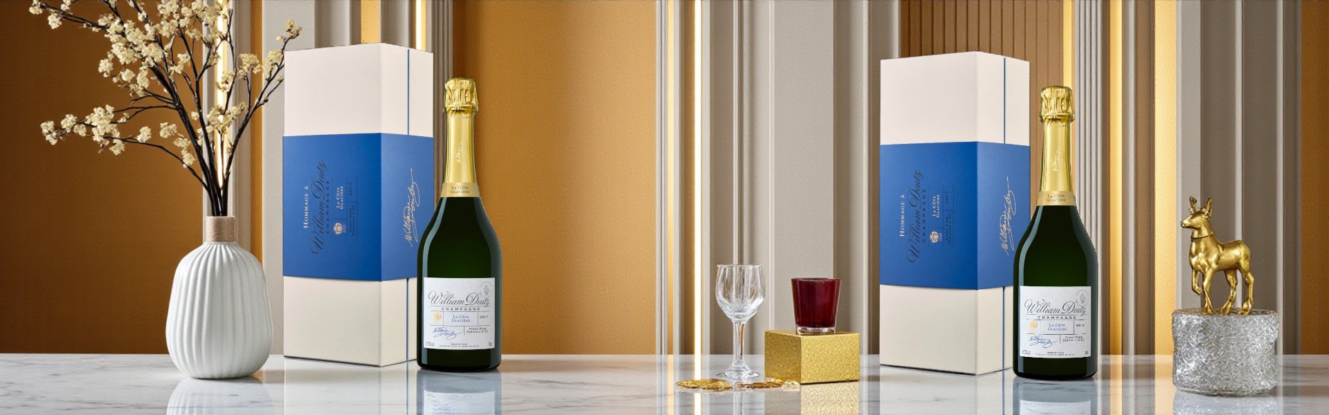 Thiết kế chai mang phong cách cổ điển, nhãn trắng thanh lịch và nắp vàng sang trọng. Hộp quà tông xanh trắng tạo điểm nhấn hiện đại và trang trọng, phù hợp làm quà tặng dịp lễ, biếu đối tác hoặc trưng bày trong tủ rượu. Logo chữ ký William Deutz tạo dấu ấn lịch sử và khẳng định sự trân trọng di sản của nhà làm rượu.