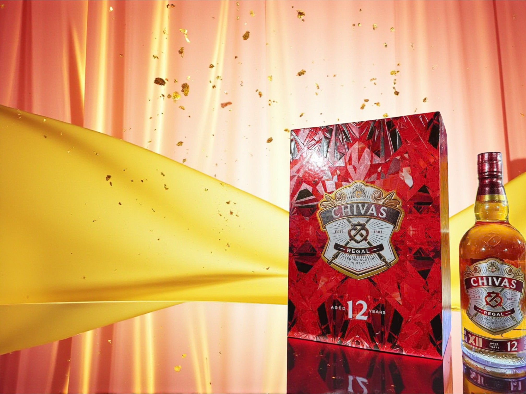 Về thiết kế, hộp quà Tết 2026 của Chivas 12 được chăm chút với hoa văn vàng kim trên nền đỏ rực rỡ, gợi cảm giác may mắn và thịnh vượng. Khi kết hợp cùng chai whisky mang sắc vàng hổ phách, tổng thể tạo nên một món quà Tết vừa đẹp mắt vừa mang ý nghĩa phong thủy.