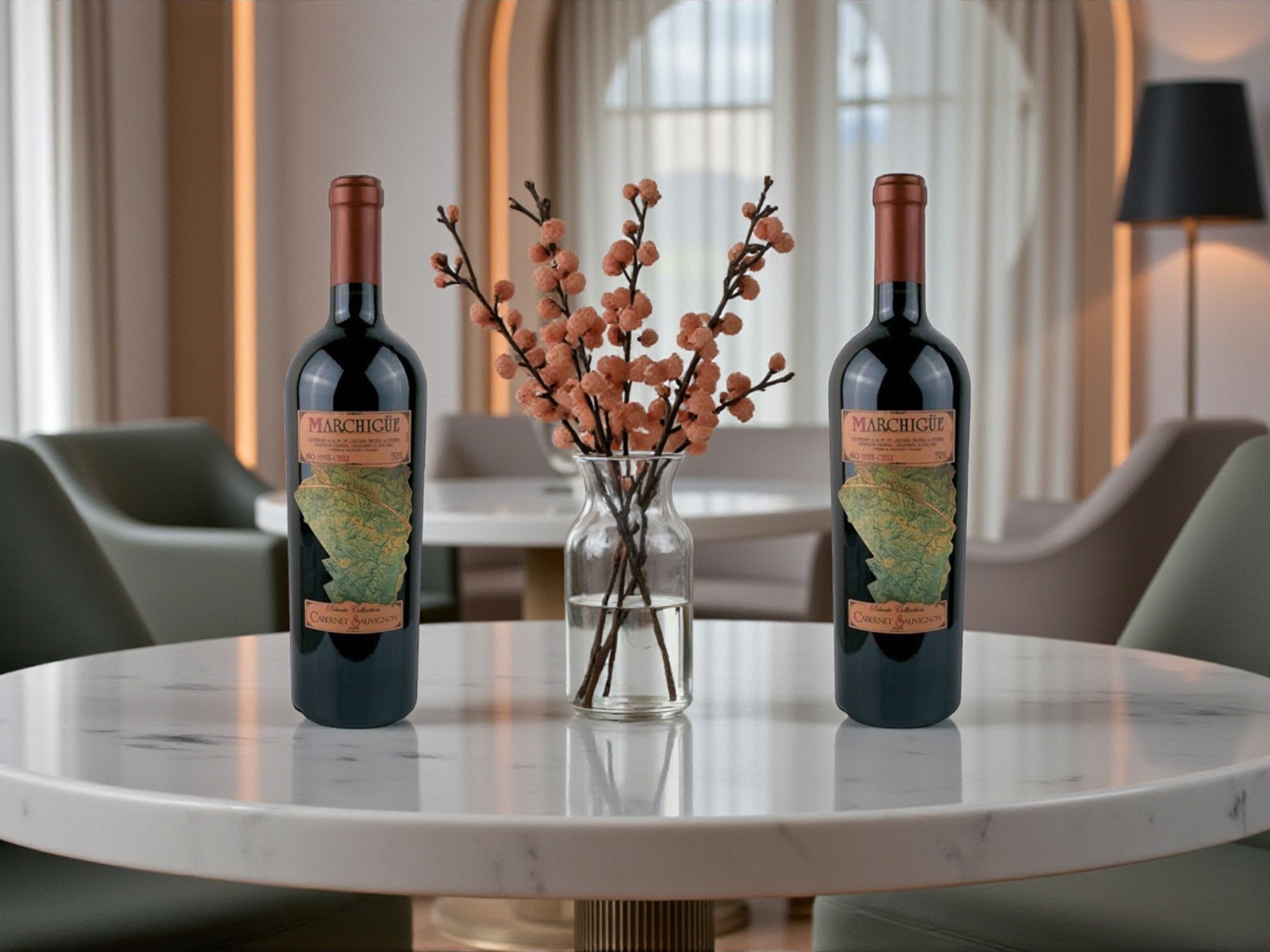 🎁 Thiết kế cổ điển sang trọng: Nhãn rượu ánh đồng in nổi họa tiết bản đồ vùng Marchigue – biểu tượng cho hành trình khai phá đất rượu Chile.