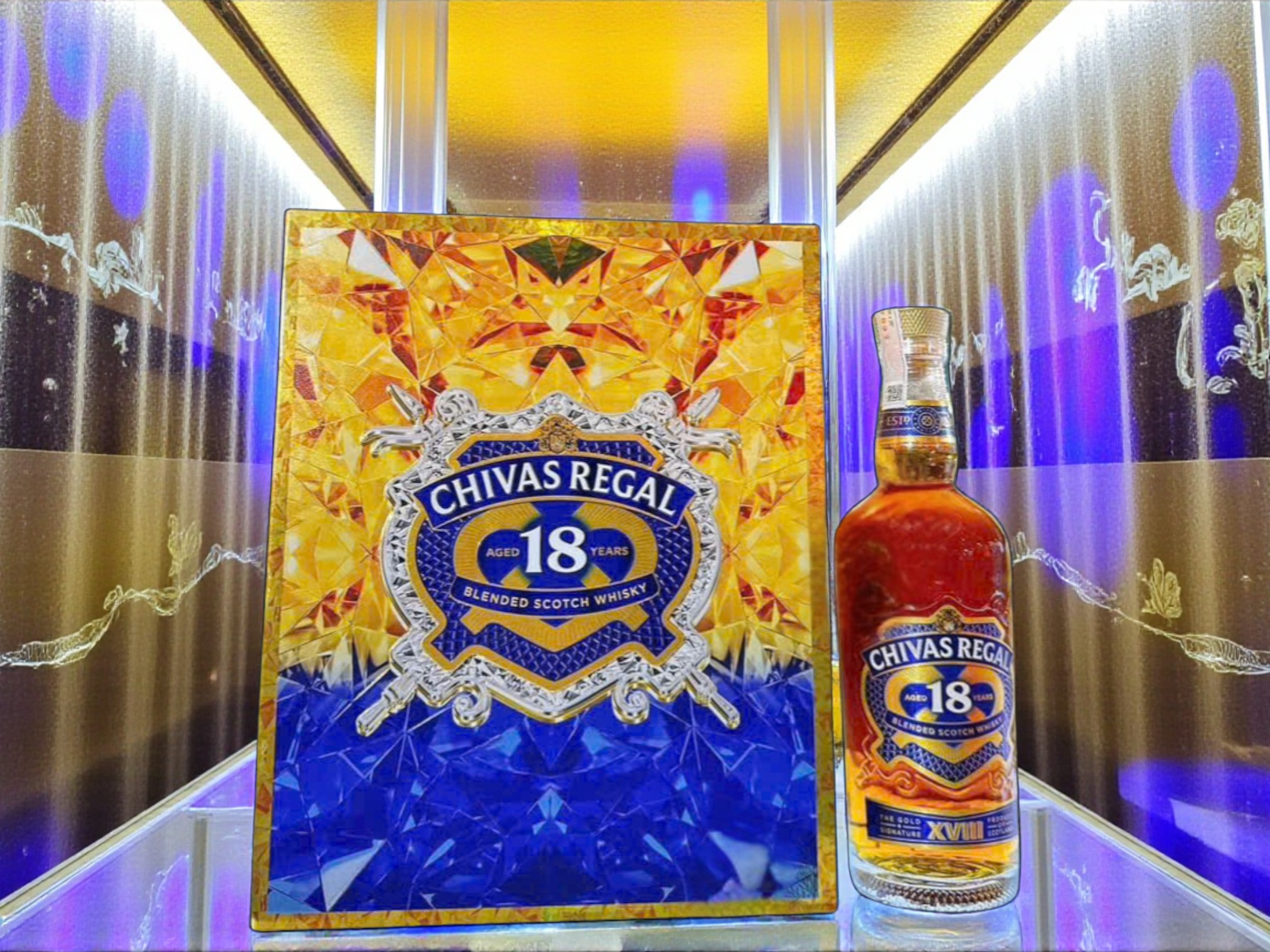 Chất liệu hộp giấy cao cấp, in dập nổi logo “Chivas Regal 18” cùng họa tiết sóng ánh kim, vừa sang trọng vừa hợp phong thủy.