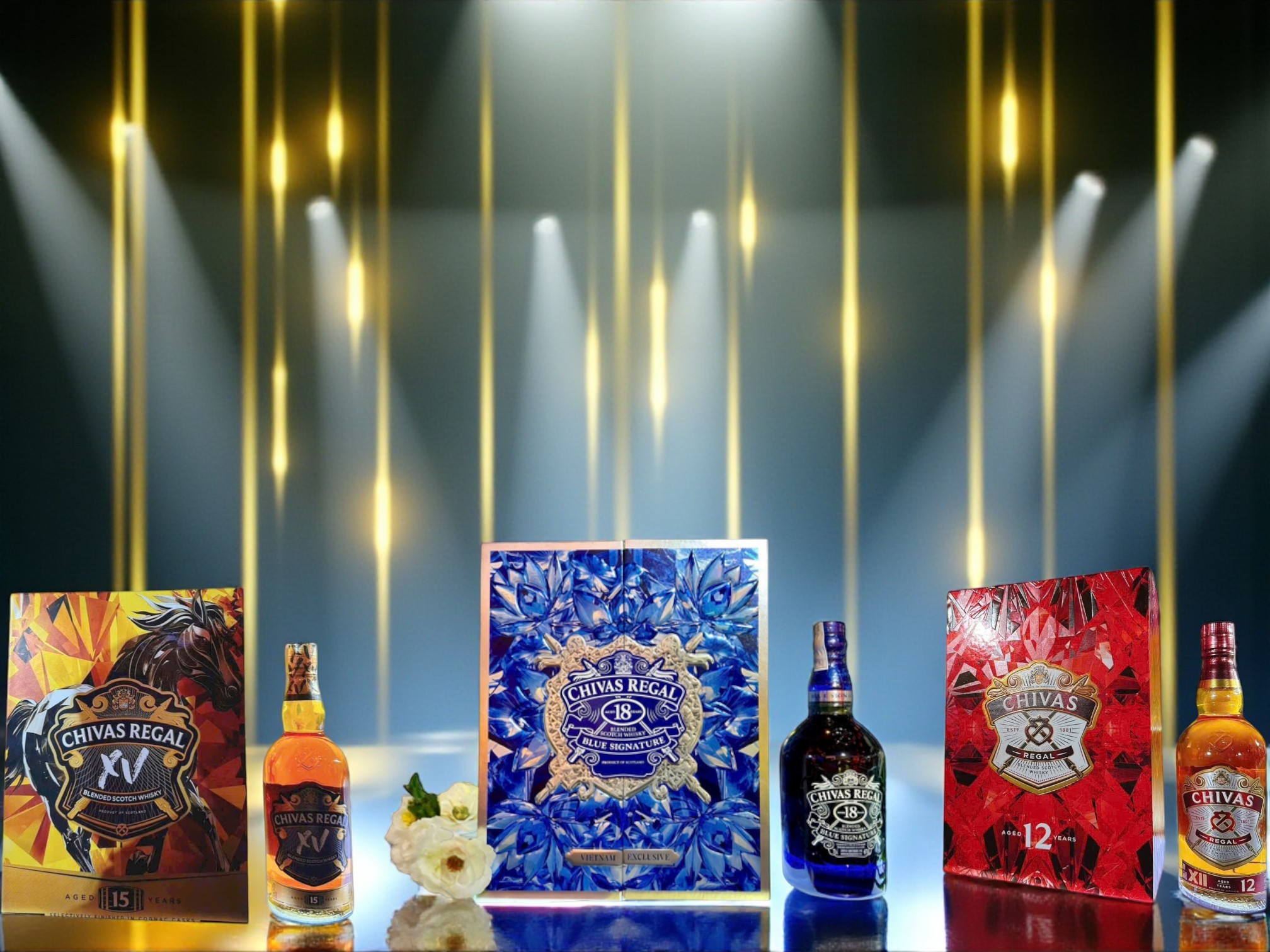 Chivas 18 Blue Signature và Chivas 15 là dòng trung cao cấp, giá hợp lý, hình thức nổi bật, dễ phối trong giỏ quà Tết. Đây là hai sản phẩm có lượng tiêu thụ cao nhất dịp cuối năm.