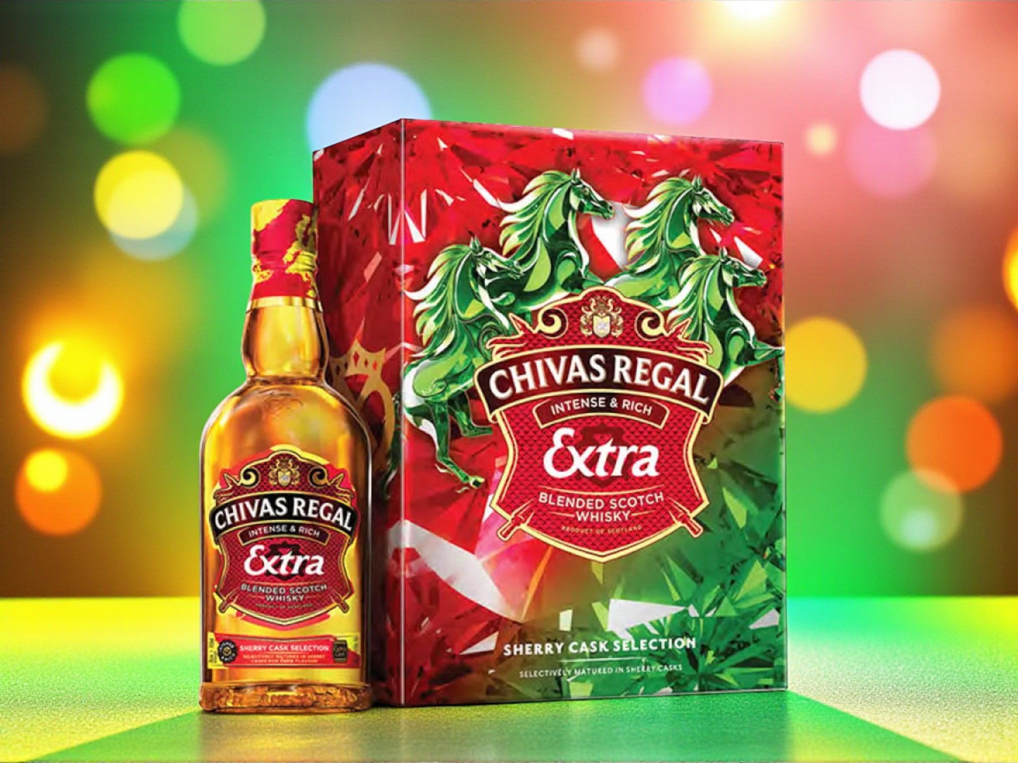 Sự hòa quyện giữa đỏ, xanh, vàng kim tạo nên tổng thể phong thủy cân bằng, vừa mạnh mẽ vừa tinh tế, khiến Chivas Extra Sherry Cask hộp quà Tết 2026 trở thành một trong những phiên bản quà Tết đẹp và ý nghĩa nhất của nhà Chivas năm nay.
