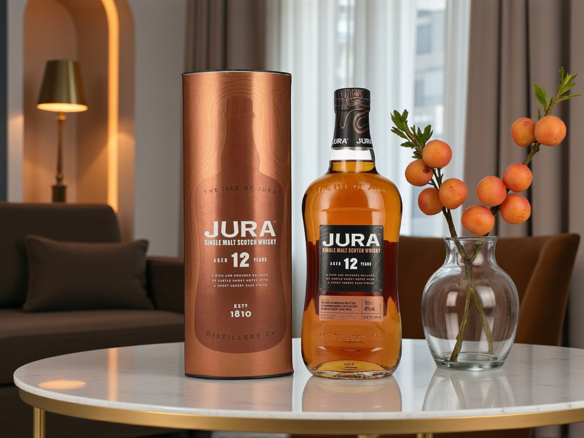 • Thiết kế: Chai dáng cong đặc trưng Jura, hộp trụ đồng sang trọng
