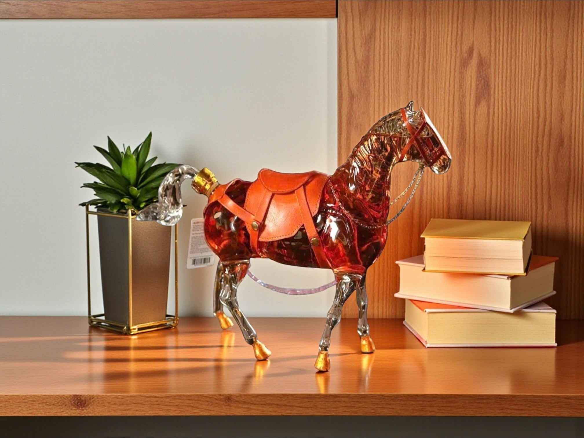 Thiết kế thân chai hình ngựa độc đáo, với chi tiết yên ngựa, bờm, đuôi và vó được mạ ánh vàng sang trọng.