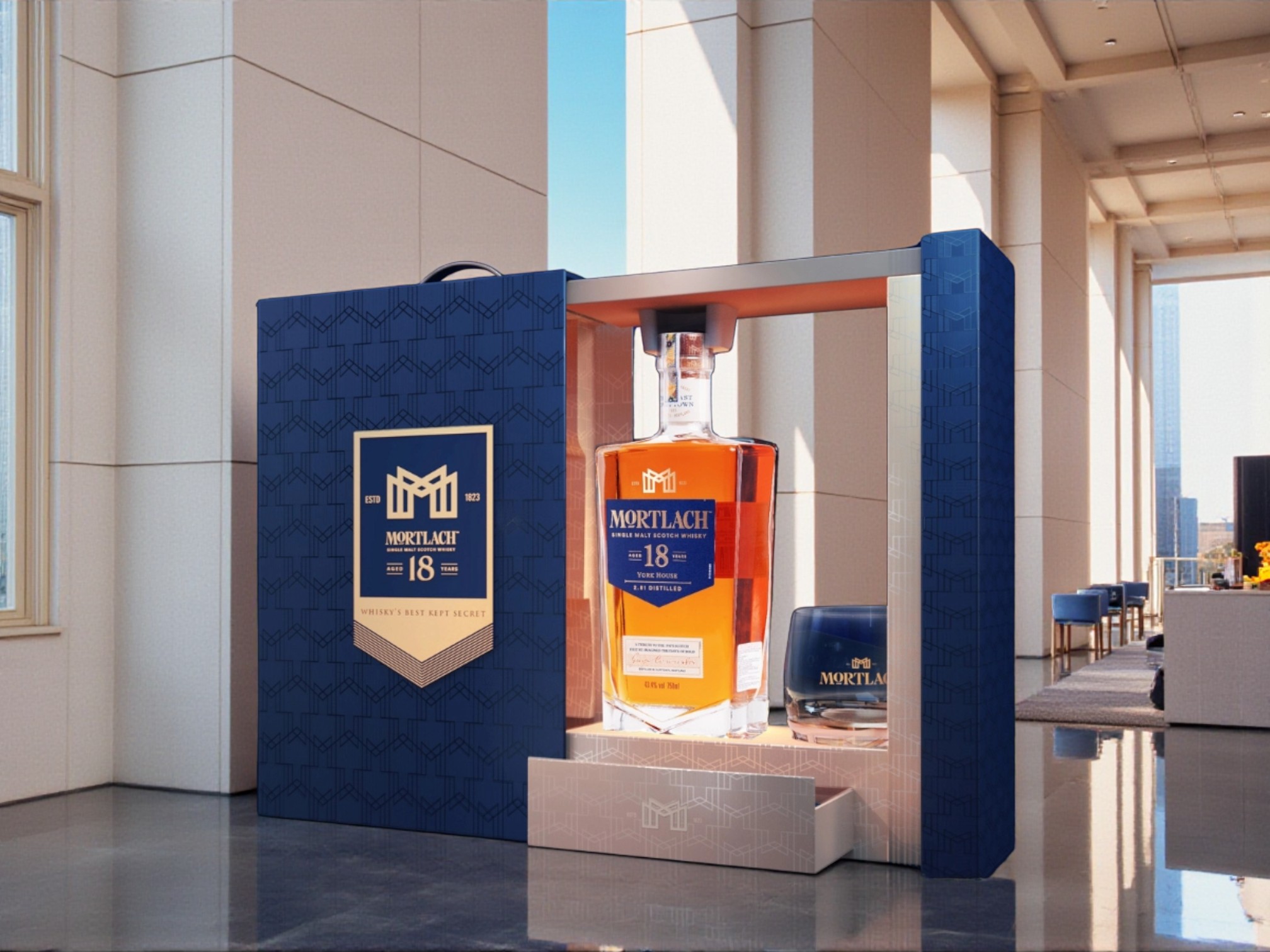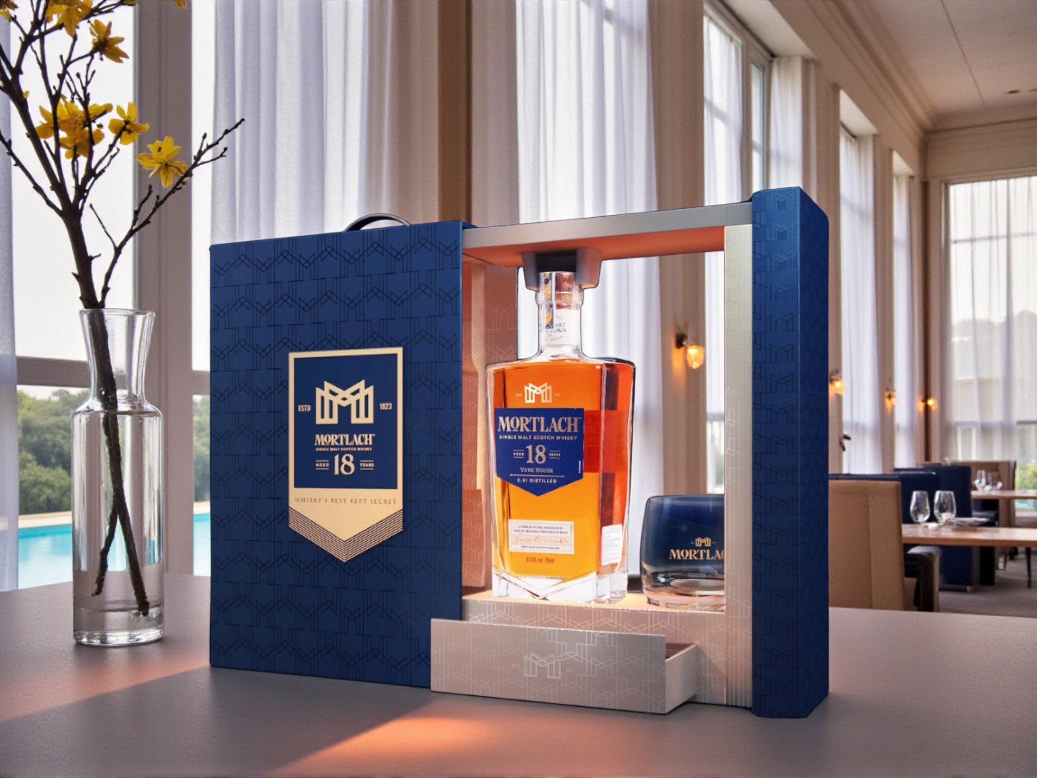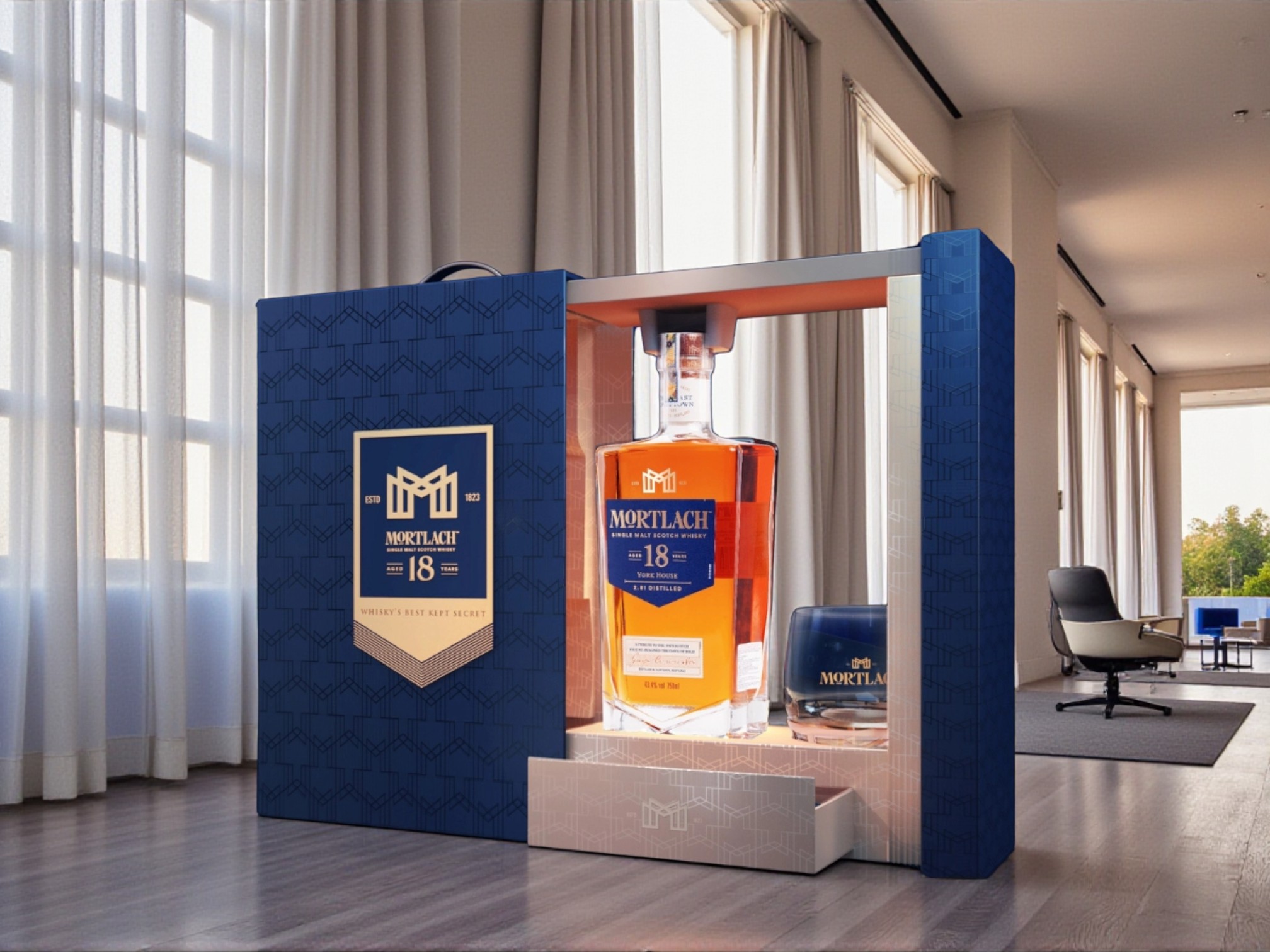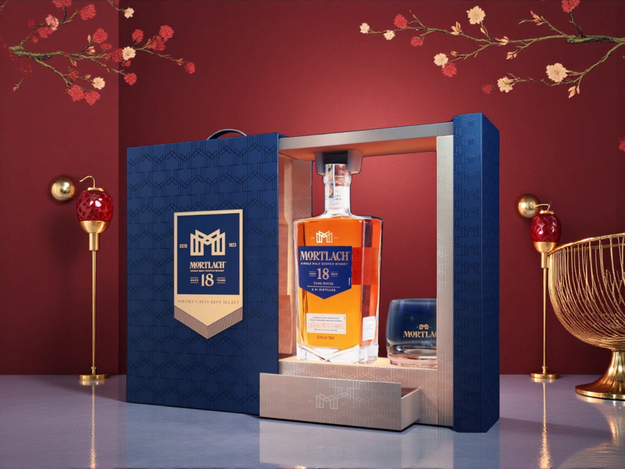 • Bao bì: Hộp quà sang trọng phối navy – gold, kèm ly pha lê Mortlach