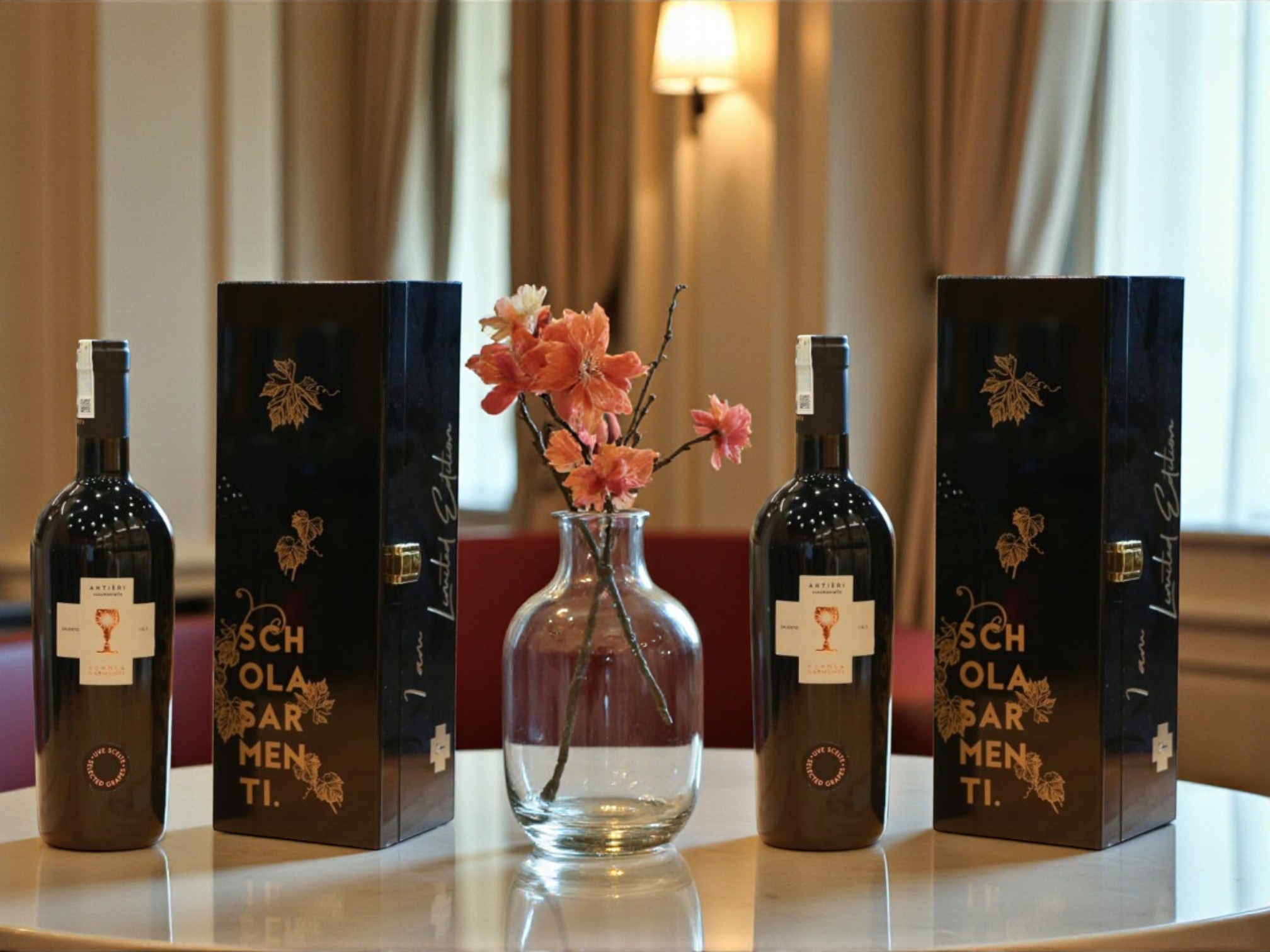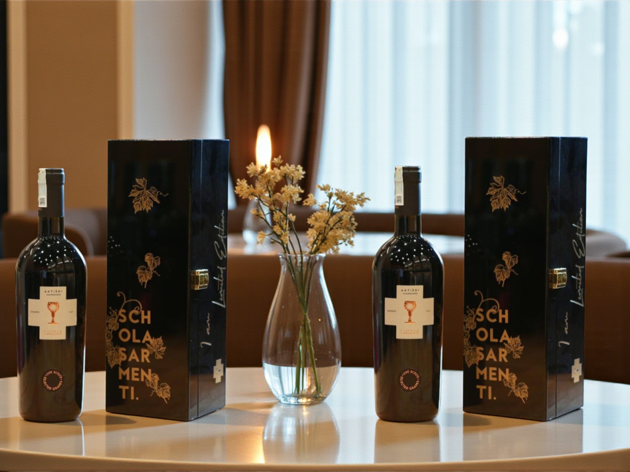 Chai vang sang trọng đi kèm hộp quà sơn mài đen ánh vàng hoặc hộp gỗ khắc logo “Schola Sarmenti” vừa mang tính thẩm mỹ, vừa thể hiện sự tôn trọng và tri ân đối tác, khách hàng.