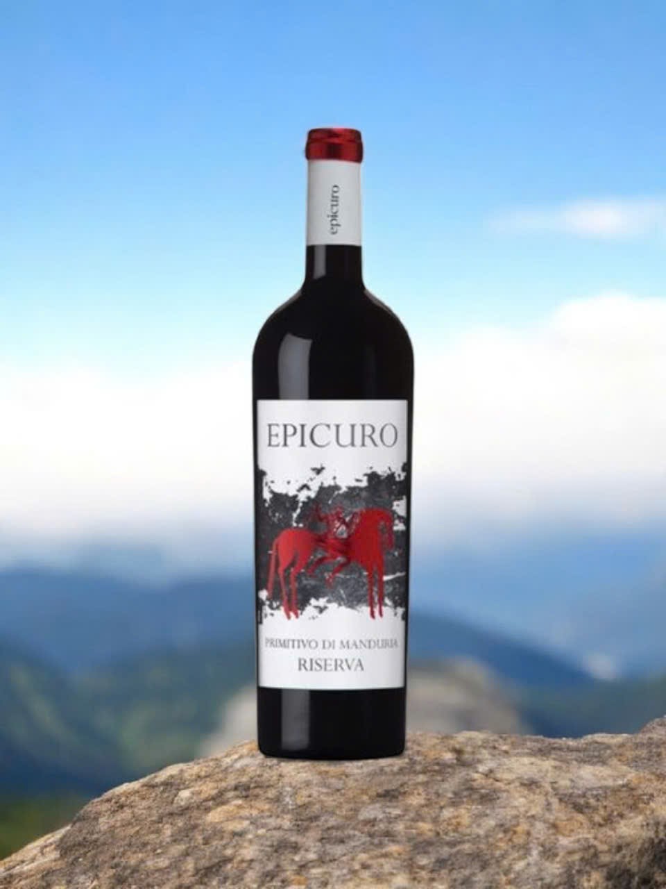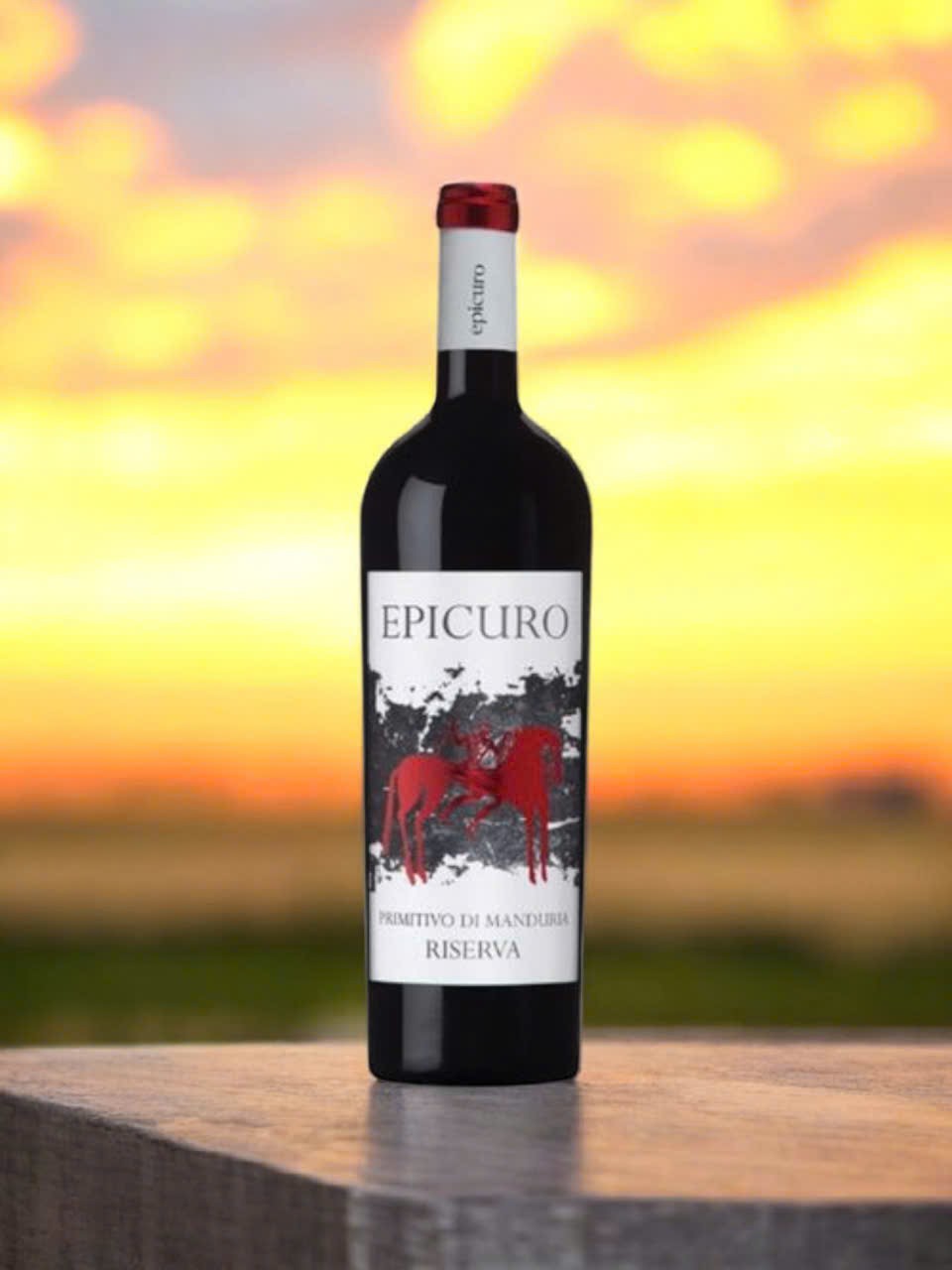 Chai rượu nổi bật với thiết kế nghệ thuật – hình ảnh hai con ngựa đỏ tượng trưng cho sức mạnh, đam mê và sự tự do. Phông chữ "EPICURO" nổi bật như một tuyên ngôn về sự cổ điển và chuẩn mực trong thế giới vang Ý.