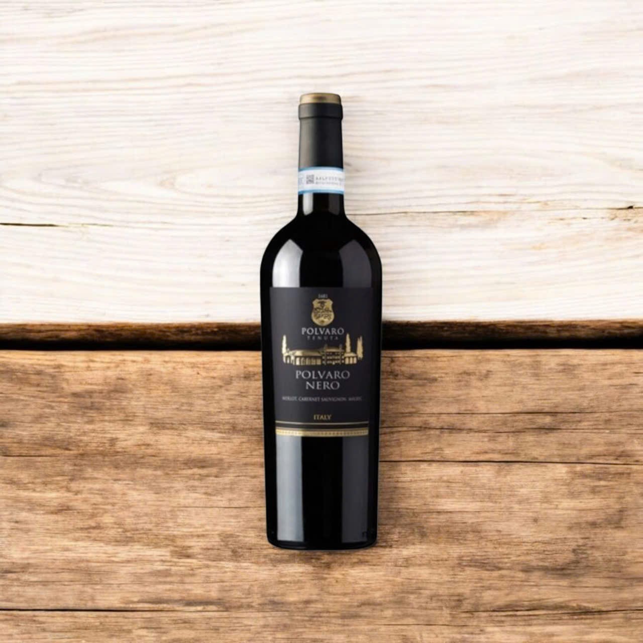 Polvaro Nero sở hữu thiết kế nhãn đen viền vàng sang trọng, logo mạ vàng tinh xảo và hình ảnh lâu đài Polvaro cổ kính in nổi bật trên thân chai – tất cả thể hiện sự quý phái và đẳng cấp Ý ngay từ cái nhìn đầu tiên.