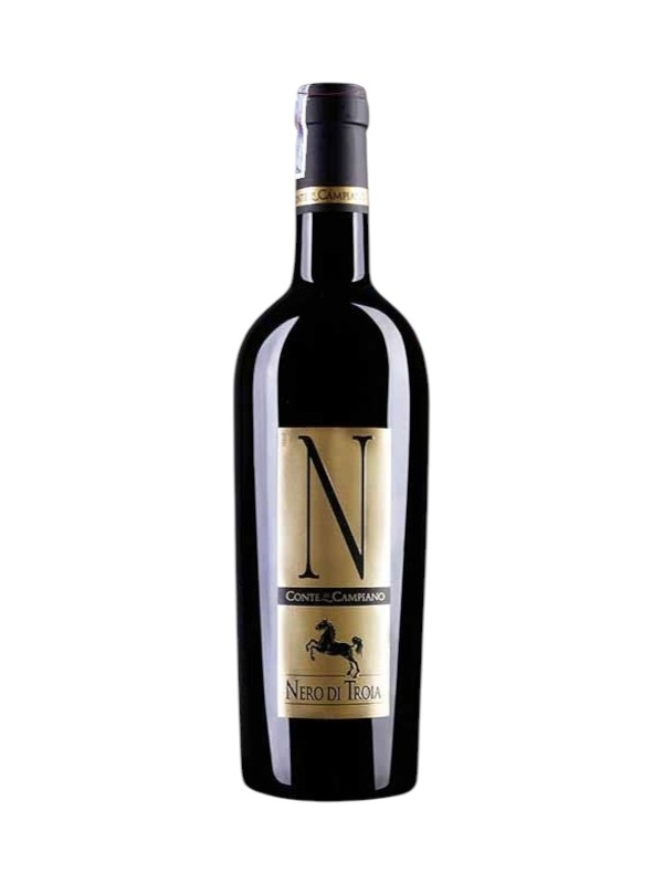 Nhãn chai màu vàng ánh kim nổi bật với chữ “N” cách điệu lớn – biểu tượng cho “Nero di Troia” – thể hiện cá tính mạnh mẽ và cao cấp.
