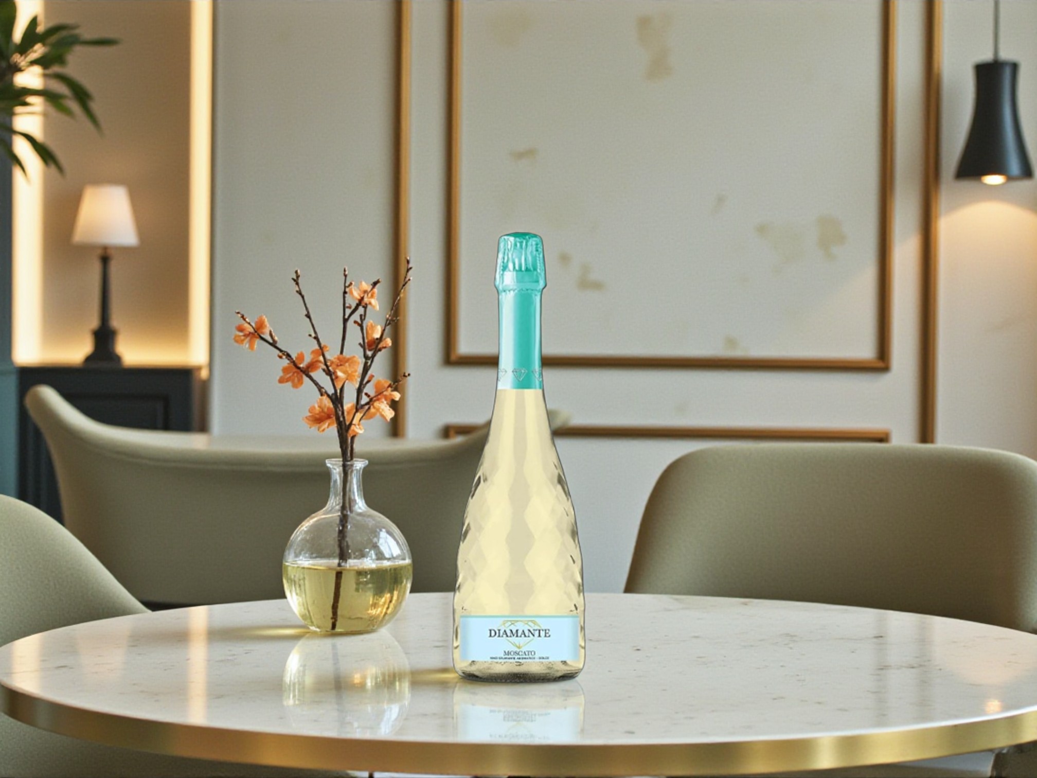 • Nhãn màu xanh pastel sáng, in rõ tên Diamante và thông tin Spumante Dolce