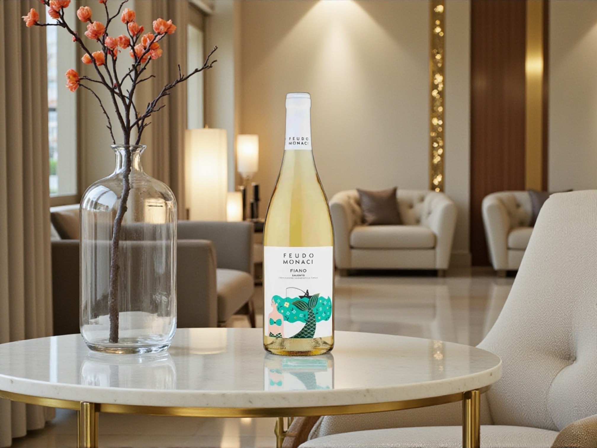 Thiết kế của Feudo Monaci Fiano IGT mang phong cách hiện đại, tinh tế nhưng vẫn giữ được nét nghệ thuật đặc trưng của vang Ý. Nhãn chai sử dụng tông màu sáng, kết hợp họa tiết minh họa mang tính biểu trưng cao, tạo cảm giác trẻ trung và khác biệt so với nhiều dòng vang trắng truyền thống.