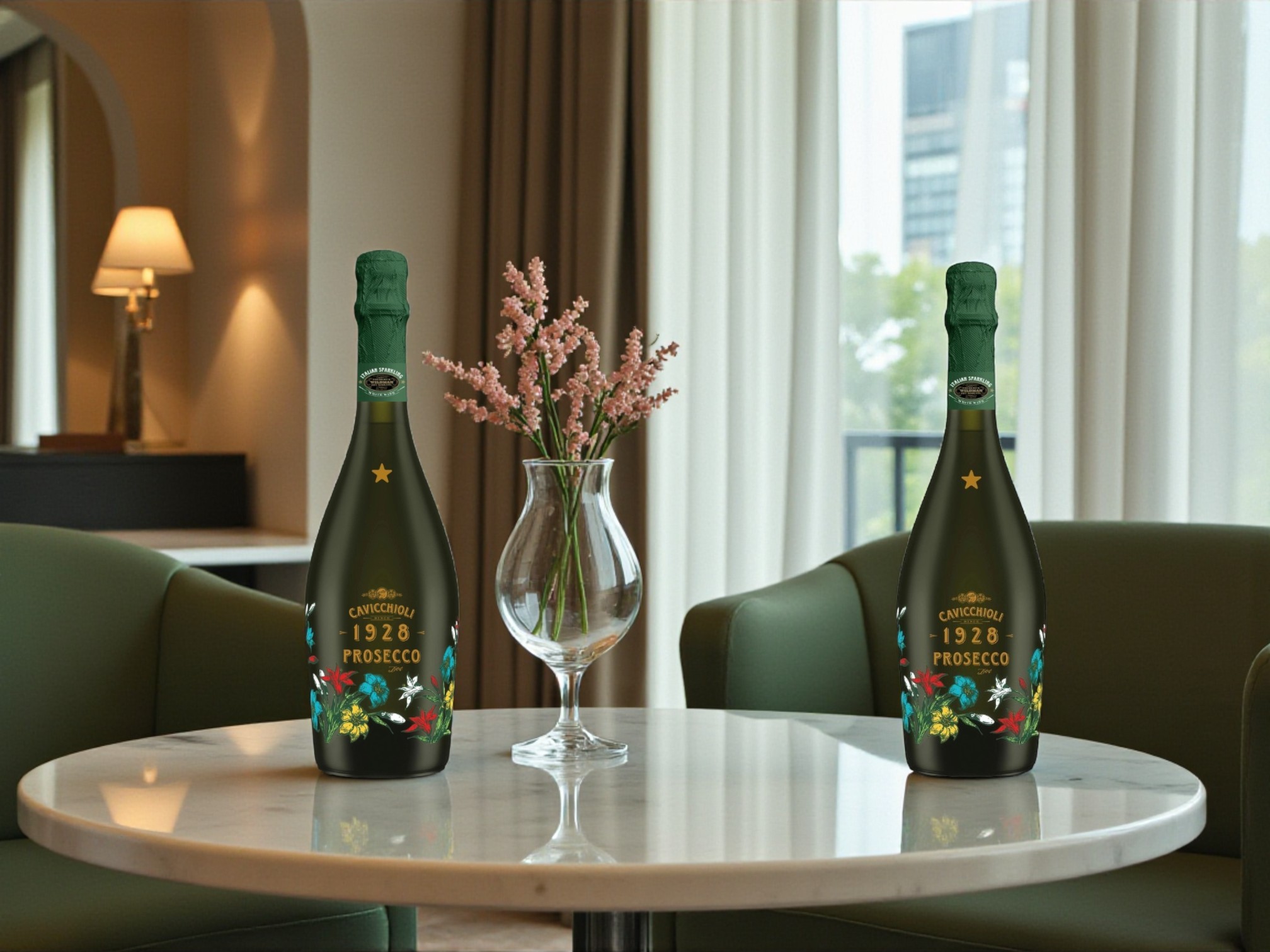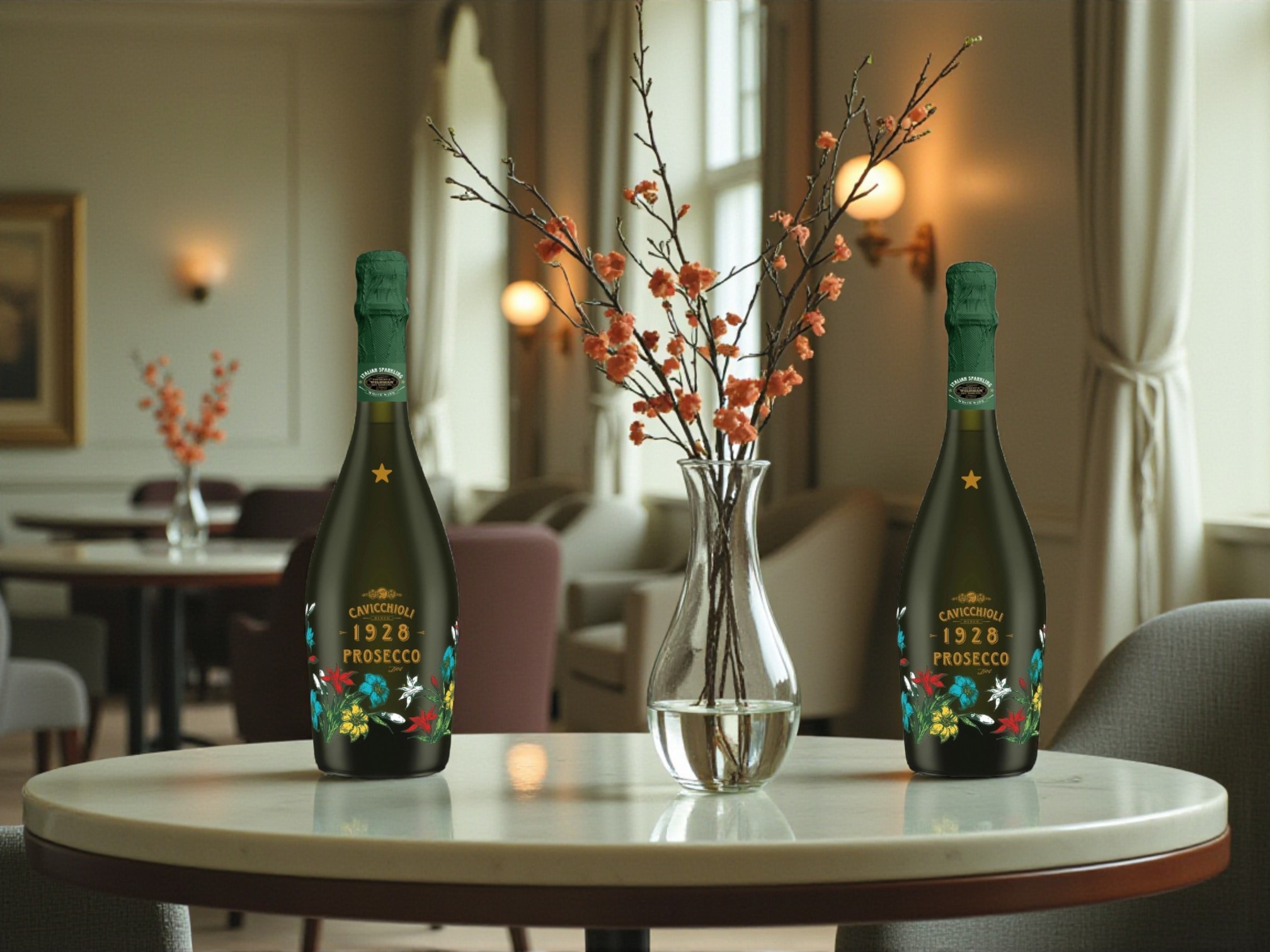 • Chữ “1928 PROSECCO” màu vàng ánh kim, cân đối.