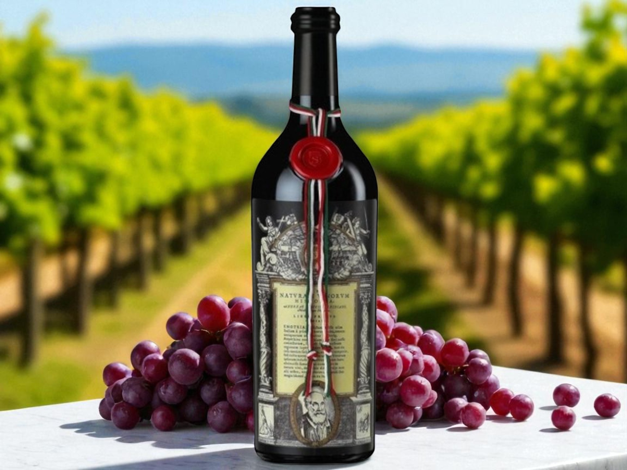 Nhãn cổ điển kiểu kiến trúc La Mã, ghi rõ thời gian ủ, năm sản xuất và chân dung một biểu tượng văn hóa.